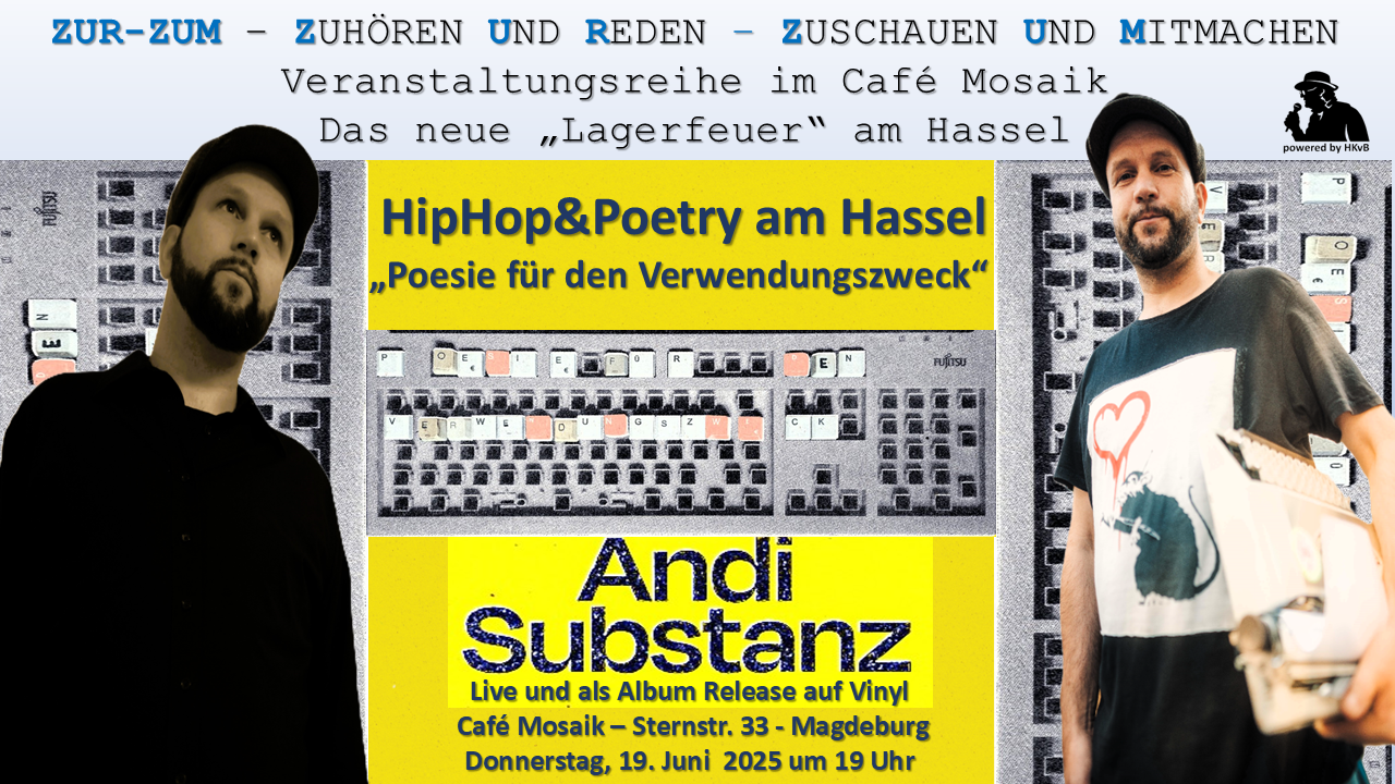 Donnerstag, 19. Juni 2025, ab 19 Uhr: Moderation/Kuration der „Poetry-HipHop-Veranstaltung mit AndiSubstanz aus Münster mit der Vorstellung seiner neuen Platte „Poesie für den Verwendungszweck“ im Café Mosaik am Magdeburger Hassel, Sternstraße 33