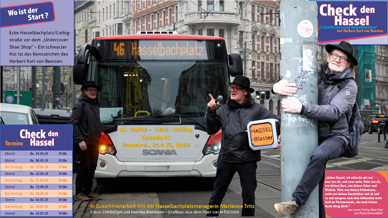 Donnerstag 24. April 2025 um 19 Uhr: Sozio-kulturelle Führung „Check den Hassel“ rund um den Hasselbachplatz. Ca. 1,5 Stunden und 2 km. Treffpunkt am Hasselbachplatz, Ecke Liebigstraße.