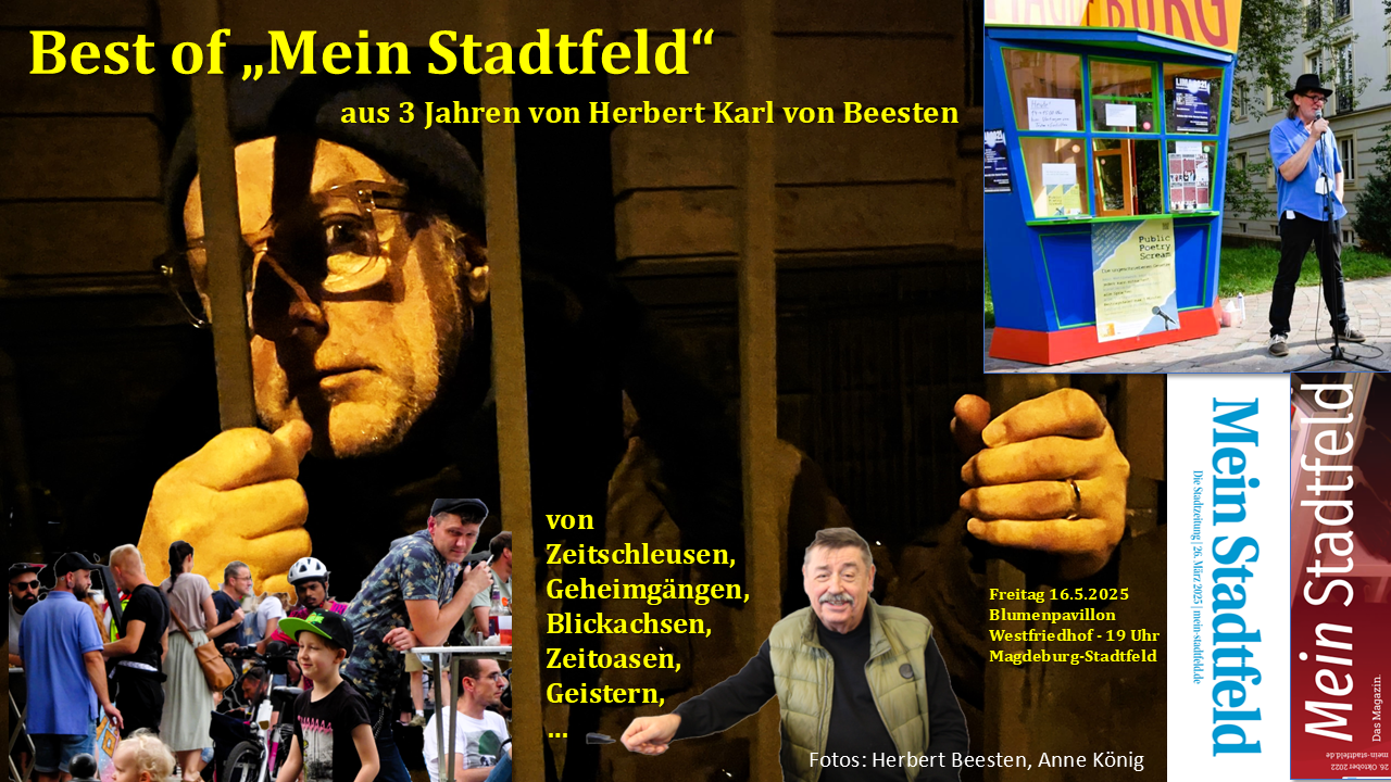 Freitag, 16. Mai 2025 ab 19 Uhr:  Best of „Mein Stadtfeld“ Sololesung Lesung/Performance mit einer Auswahl meiner über 50 Artikeln seit 2022 aus der sozio-kulturellen Stadtfeld-Szene. So z.B. über den „Temponauten Kalle“, oder aus einer mysteriösen Stadtfeldkrimivision des Schauspielers und Regisseurs Marcus Kalhoff, oder über eine bizarre Begegnung im Oli-Kino oder seltsame Gegenstände und Kunstwerke aus den Ateliers und Laboren der im Stadtfeld beheimateten Maler und Künstlerinnen. Im ehemaligen Blumen-Pavillon des Magdeburger Westfriedhofs (Große Diesdorfer Str. 160, 39110 Magdeburg). Eine Veranstaltung im Rahmen der Ausstellung „Neues Bauen / Farbiges Magdeburg“