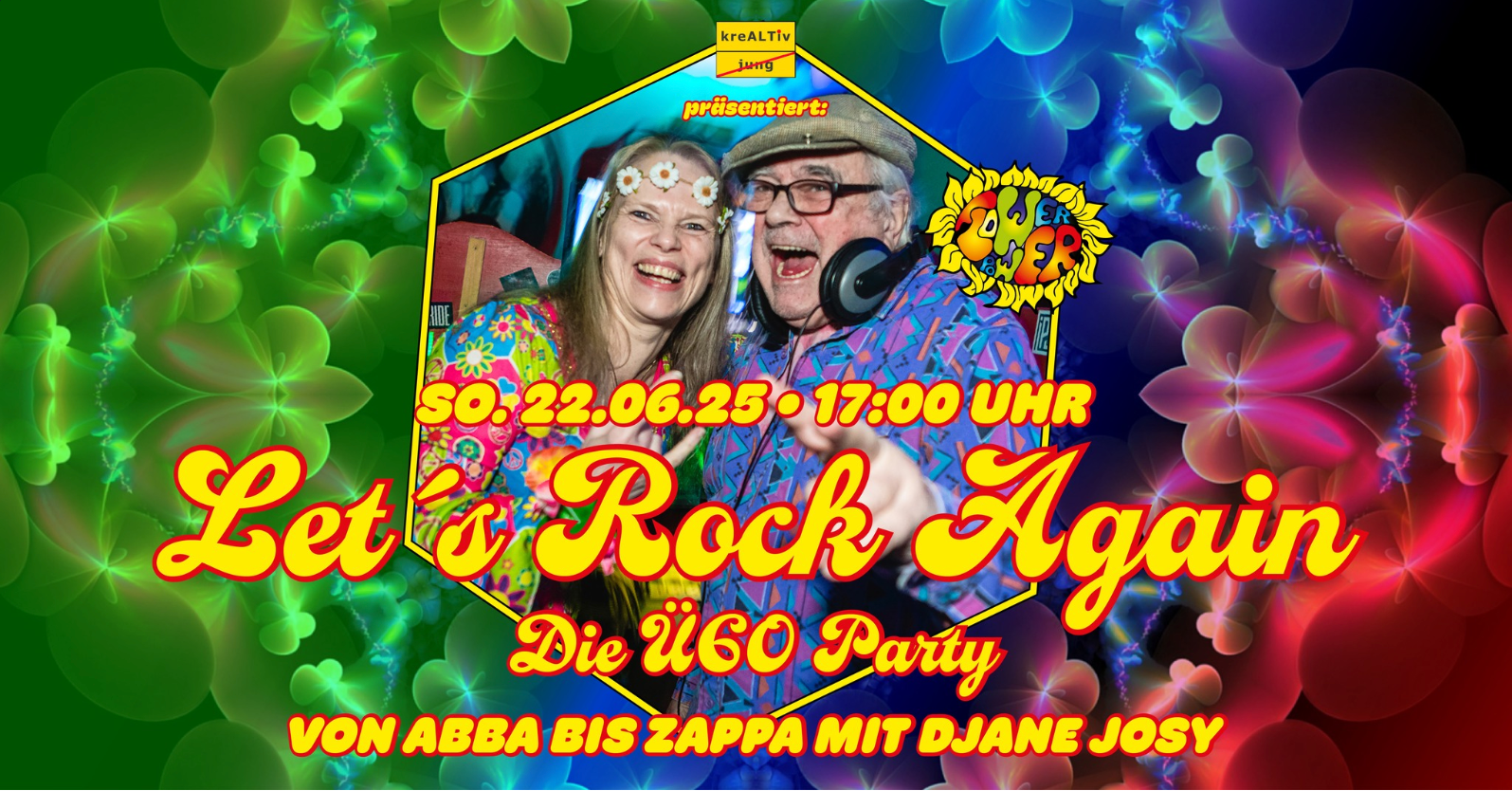Sonntag, 22. Juni 2025 17 bis 22 Uhr „Let’s Rock Again“ - Ü60-Party im Flower-Power, organisiert von mir und Janet Knoll vom Flowerpower, Einsteinstraße/Ecke Breiterweg