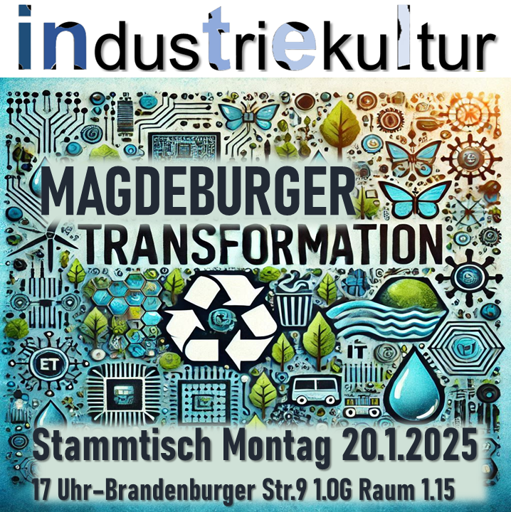 Am Montag 20. Januar 2025 17 Uhr: Erster Magdeburger Transformations-Stammtisch, Gemeinsam organisiert mit May Heywood in meinem kreALTiv-Labor, im Kultur- und Kreativwirtschaftszentrum, Brandenburger Str. 9, 39104 Magdeburg – Detrails siehe auch:  Aufwärtskompatibel? Neue Industriekultur in Magdeburg durch Intel?: # 079 „Transformation in Magdeburg“ - Einladung - Offener Stammtisch/Round Table am 20.1.2025