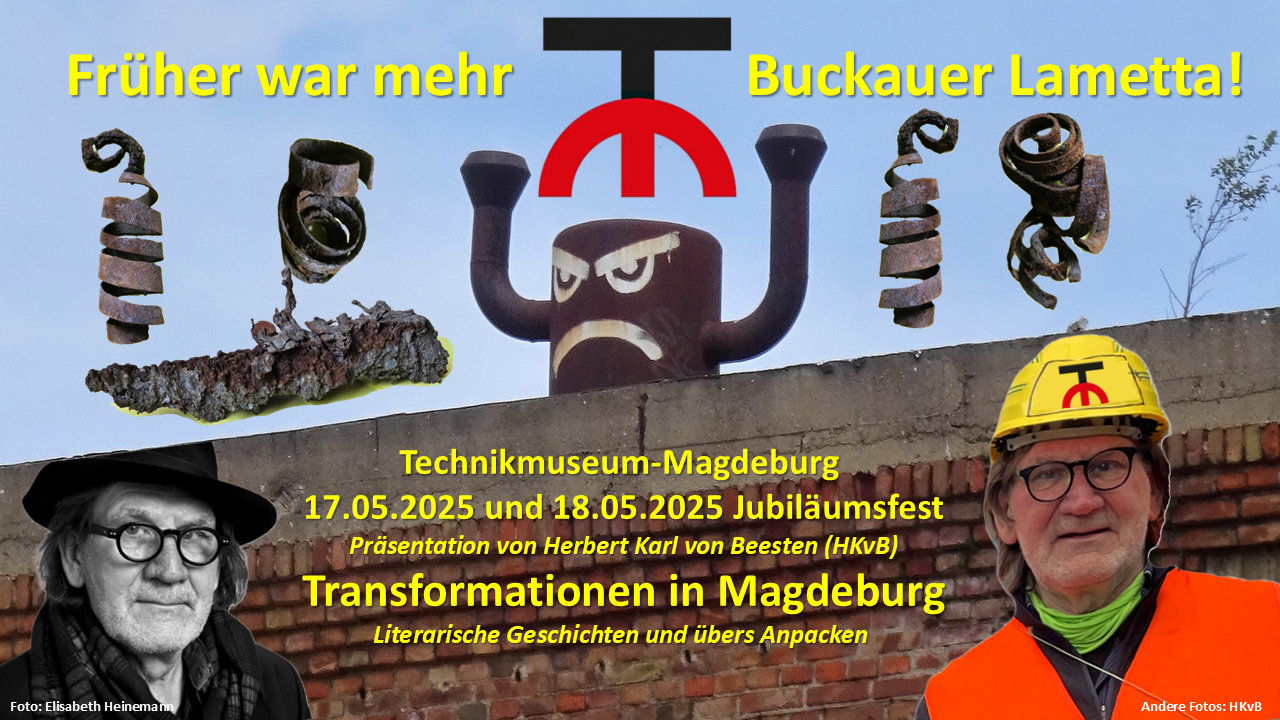 Vorschau, Details folgen: Freitag, 17. Mai 2025 und Samstag 18. Mai 2025: Vortrag „Früher war mehr Buckauer Lametta - Transformation in Magdeburg: Gestern, heute und morgen – mal etwas anders“. Im Magdeburger Technikmuseum anlässlich der Museumsnacht und Jubiläum,  Dodendorfer Straße 65, 39112 Magdeburg Technikmuseum Magdeburg / Landeshauptstadt Magdeburg - magdeburg.de