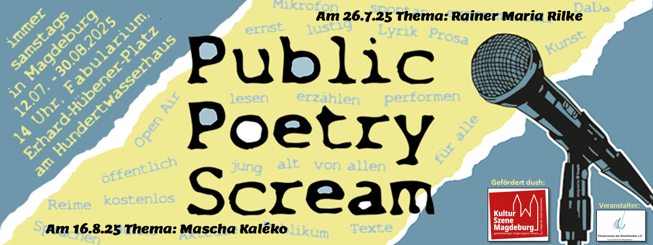 Samstag, 9. August 2025 von 14 bis 15 Uhr. Moderation beim Public Poetry Scream des Fördervereins der Schriftsteller und Schriftstellerinnen e.V. Vor der Buchhandlung FABULARIUM im Hundertwasserhaus, Erhard-Hübner-Platz, 39104 Magdeburg.