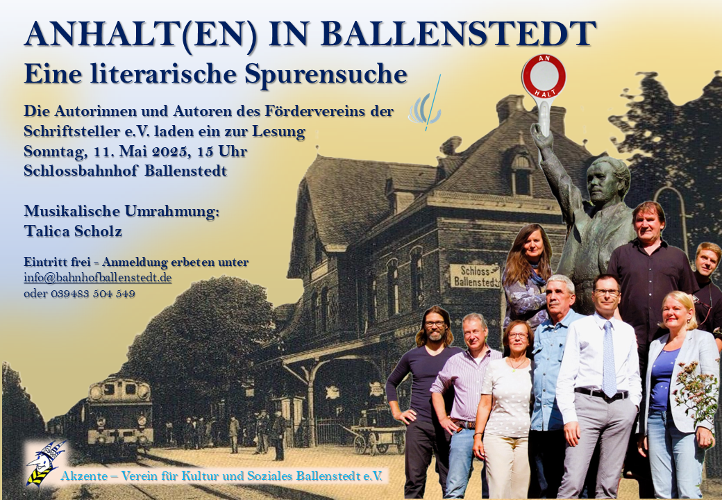 Sonntag, 11. Mai 2025 – 15 Uhr „Anhalt(en) in Ballenstedt – Lesung mit Kollegen und Kolleginnen des Fördervereins der Schriftsteller e.V. im Schlossbahnhof in 06493 Ballenstedt, Bebelstr. 19.