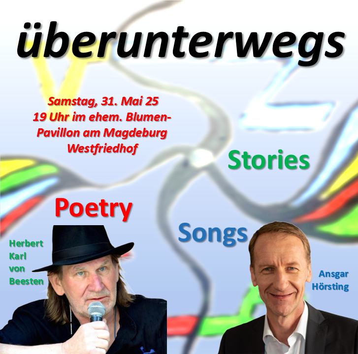 Samstag, den 31. Mai 2025 ab 19 Uhr: überunterwegs – Stories, Songs, Poetry: Eine Duo-Lesung gemeinsam mit Ansgar Hörsting im ehemaligen Blumen-Pavillon des Magdeburger Westfriedhofs (Große Diesdorfer Str. 160, 39110 Magdeburg). Eine Veranstaltung im Rahmen der Ausstellung „Neues Bauen / Farbiges Magdeburg“