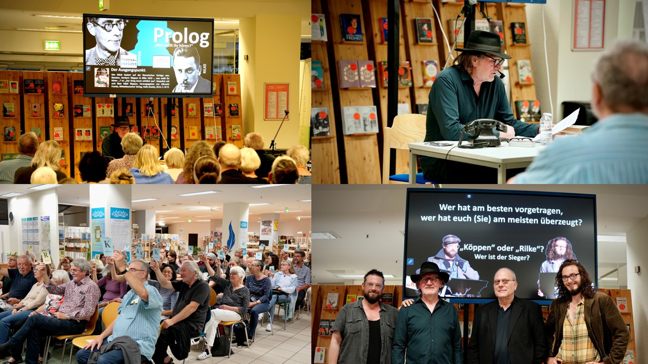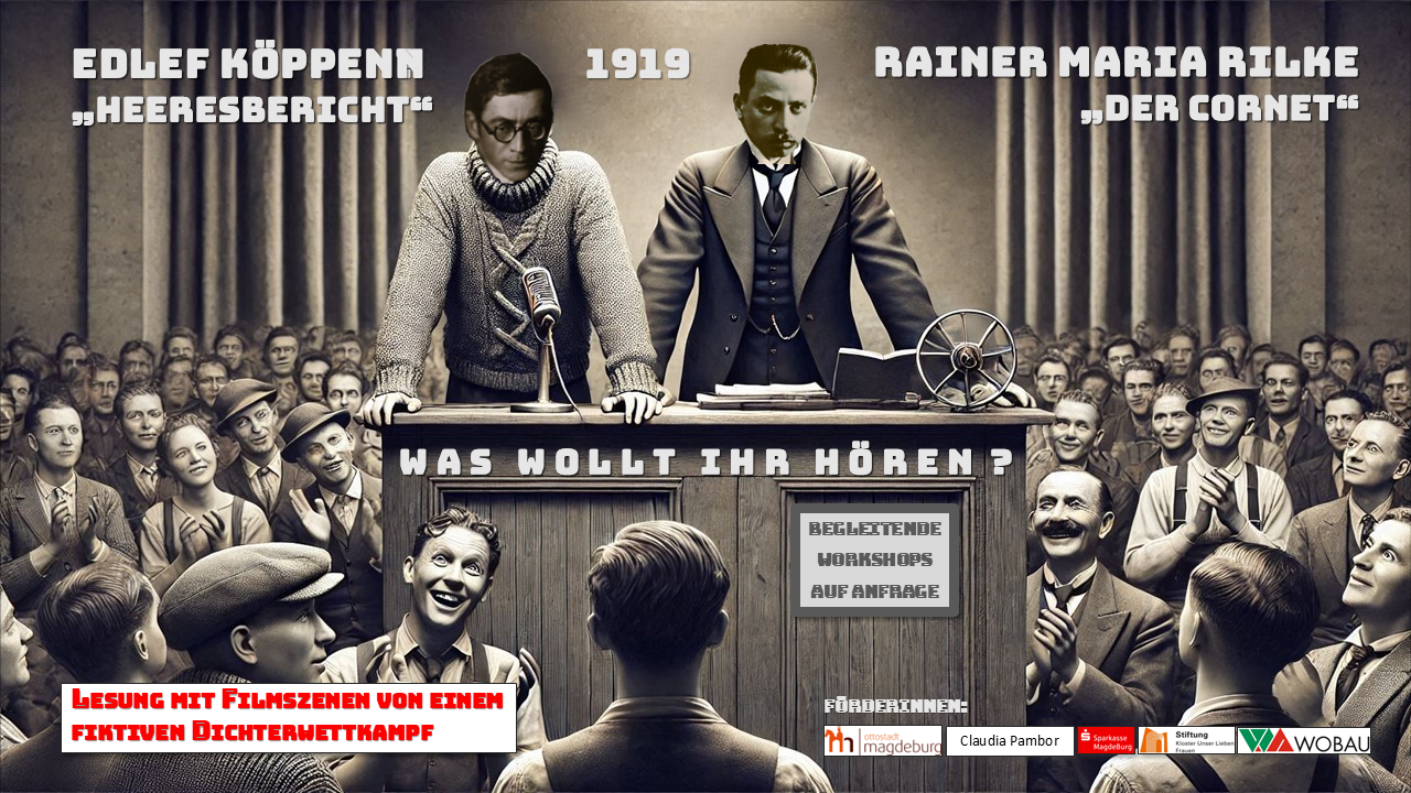 Dienstag, 9. September 2025 an 19:30 Uhr poeMOVIEtry – Lesung/Performance mit Filmszenen in „Was wollt ihr hören?“ Köppen oder Rilke – passend zum Rilke-Jahr - in der Stadtbibliothek Magdeburg, Breiter Weg  109