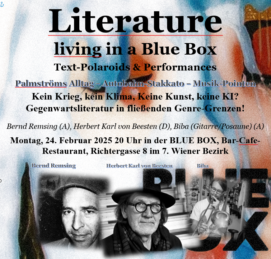 Montag, 24. Februar 2025 20 Uhr: Literature - living in a Blue Box - Text-Polaroids & Performances: Palmströms Alltag ‒ Autobahn-Stakkato ‒ Musik-Pointen / Gemeinsam mit Bernd Remsing (A) und Biba (Gitarre/Posaune) (A) in der BLUE BOX, Bar-Cafe-Restaurant, Richtergasse 8 im 7. Wiener Bezirk