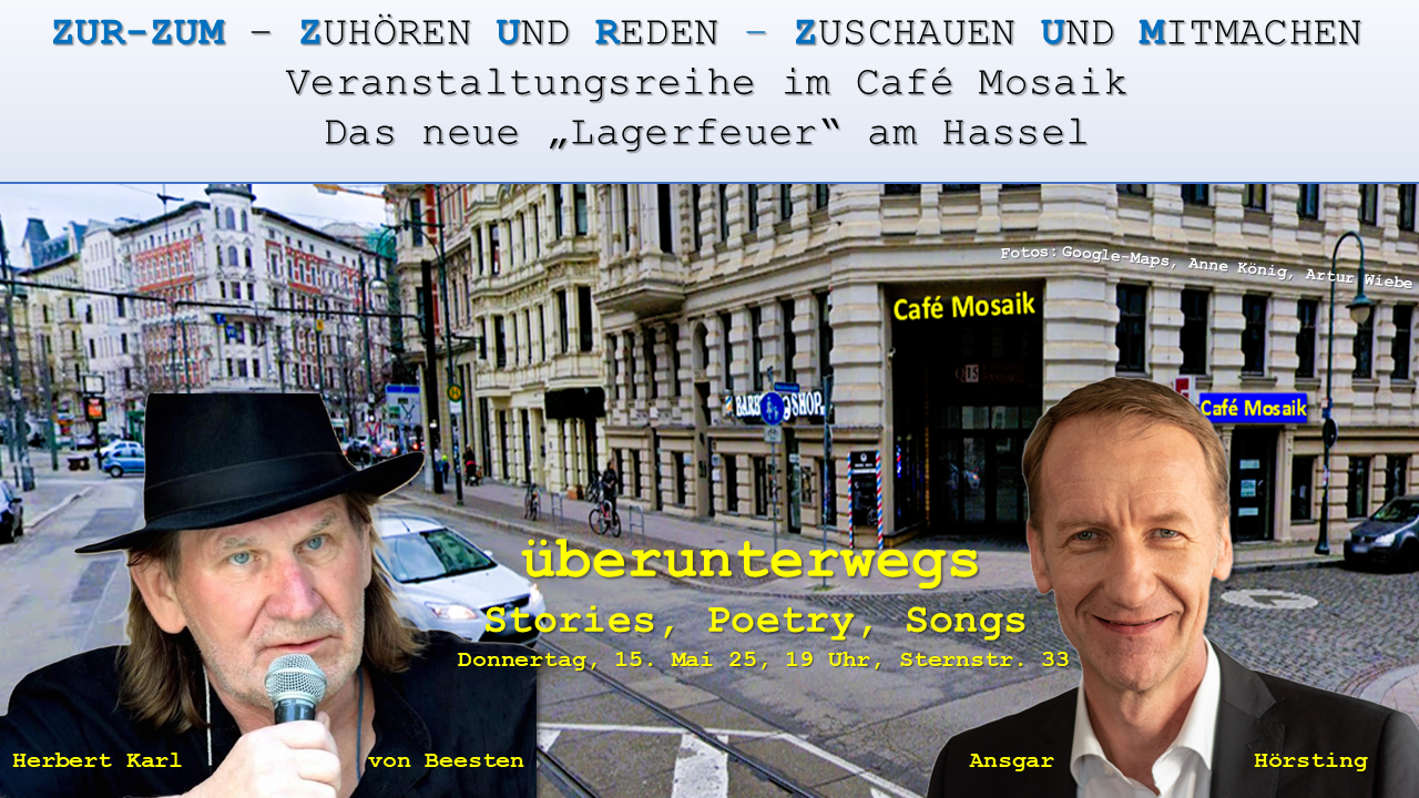 Donnerstag 15. Mai 2025 19 Uhr:  überunterwegs – Die Dreifach-Premiere - Neues Café, ein neugegründetes Autoren-Duo am Hassel-Kiez und Start der Veranstaltungsreihe ZuR-ZuM als „Lagerfeuer“ am Hassel